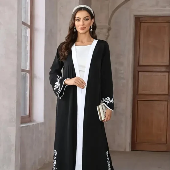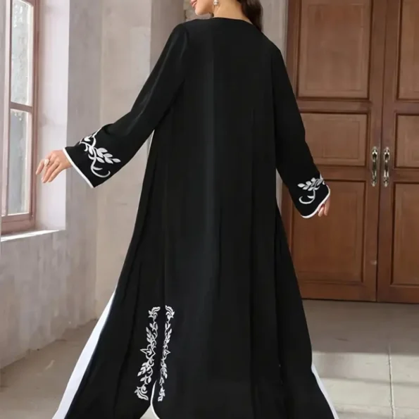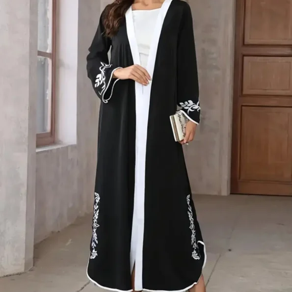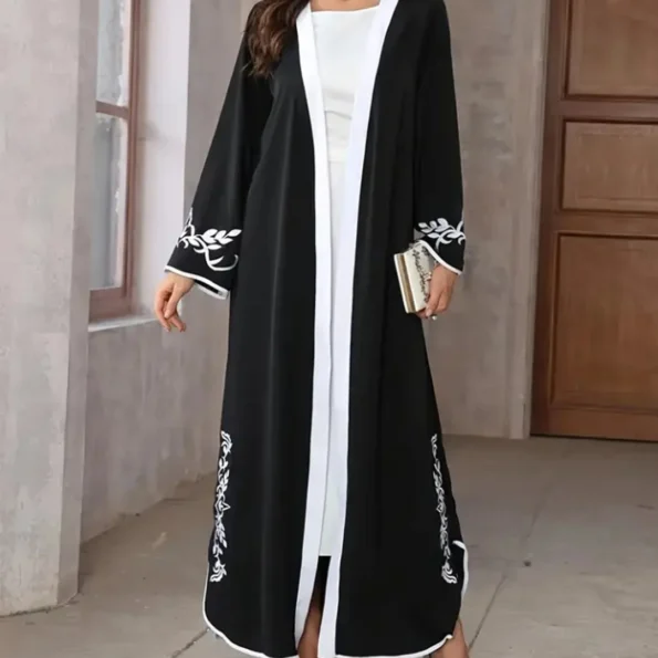 تميّزي بإطلالة راقية وبسيطة مع هذه العباءة السوداء، التي تتميز بتفاصيل تطريز ناعمة باللون الأبيض على الأكمام والحواف.