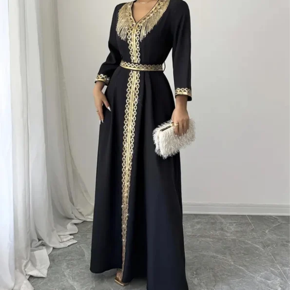 - حزام قابل للتعديل بنفس التطريز الذهبي لإبراز الخصر